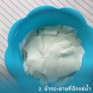 2. นำกระดาษที่ฉีกแช่น้ำทิ้งไว้ประมาณ 1 วัน หรือสำหรับใครที่มีเครื่องปั่นและไม่อยากรอนาน สามารถแช่ทิ้งไว้ 4 ชั่วโมง จากนั้นเอาน้ำออกและเข้าเครื่องปั่นได้เลย